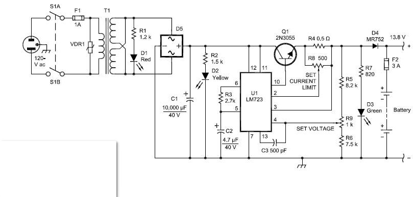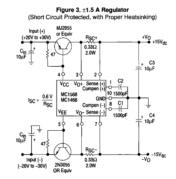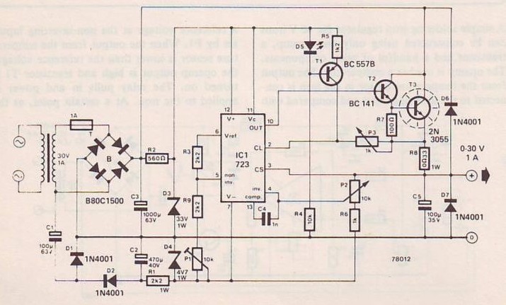 Existem diversos circuitos com este CI e a configuração básica é esta acima. Algumas variações podem limitar a tensão máxima de saída e outras, aumentar a capacidade de corrente, com transistores Darlington ou fila de transistores mais potentes. A configuração abaixo é de uma revista antiga, Elektor que usa uma fonte ‘negativa’ para alimentar o circuito de referência e assim obter o zero volt na saída. Também possui diodos para proteção de polarização invertida. o zener na alimentação (pino 12 e 11) limita a tensão máxima para proteção do circuito integrado.