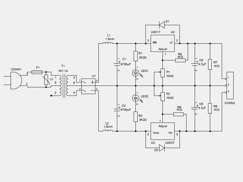 Outra fonte simples que me salvou muitas vezes foi a com o LM317. Neste diagrama, acrescentou-se alguns diodos para proteger o CI. Estes diodos previnem que capacitores na saída se descarreguem no circuito da saída do CI ou em caso de você ligar a fonte em um circuito energizado pode engano.