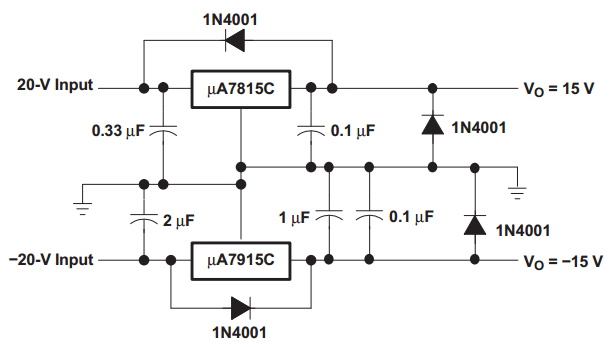 Ou ainda utilizar CI’s em paralelo para aumentar a corrente fornecida, como o circuito abaixo: